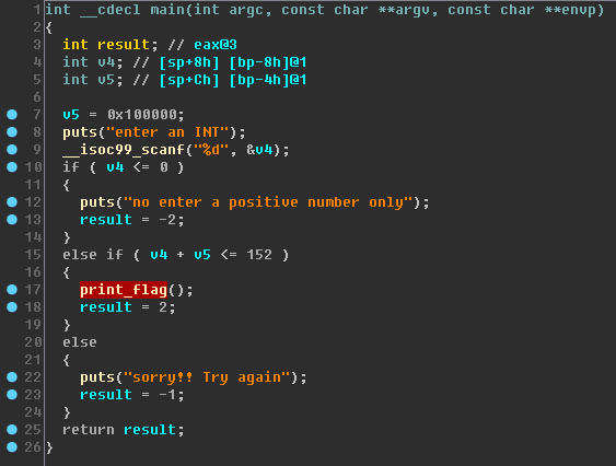 여기에 v5에 담긴 0x100000이 더해진다면 당연히 양의 범위를 넘겨서 음수가 나올 것이다.