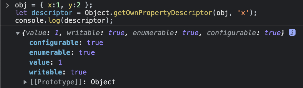 let descriptor = Object.getOwnPropertyDescriptor(obj, propertyName); // obj는 정보를 얻고자 하는 객체 // propertyName은 정보를 얻고자 하는 객체 내 프로퍼티