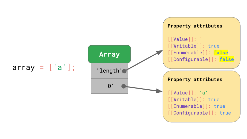 obj 객체의 'x' property에 대한 attributes JavaScript Array는 Object와 유사한 형태를 갖지만 length라는 property가 추가된다.