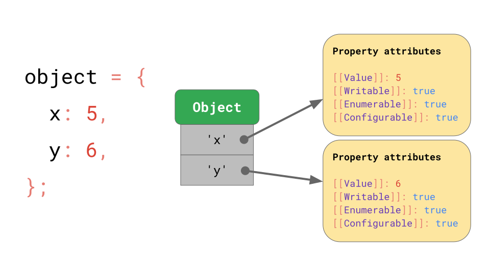Object Model 하지만 실제 Object property attributes에는 x, y에 해당하는 [[Value]]를 제외하고도 3개의 property attributes가 더 있다.