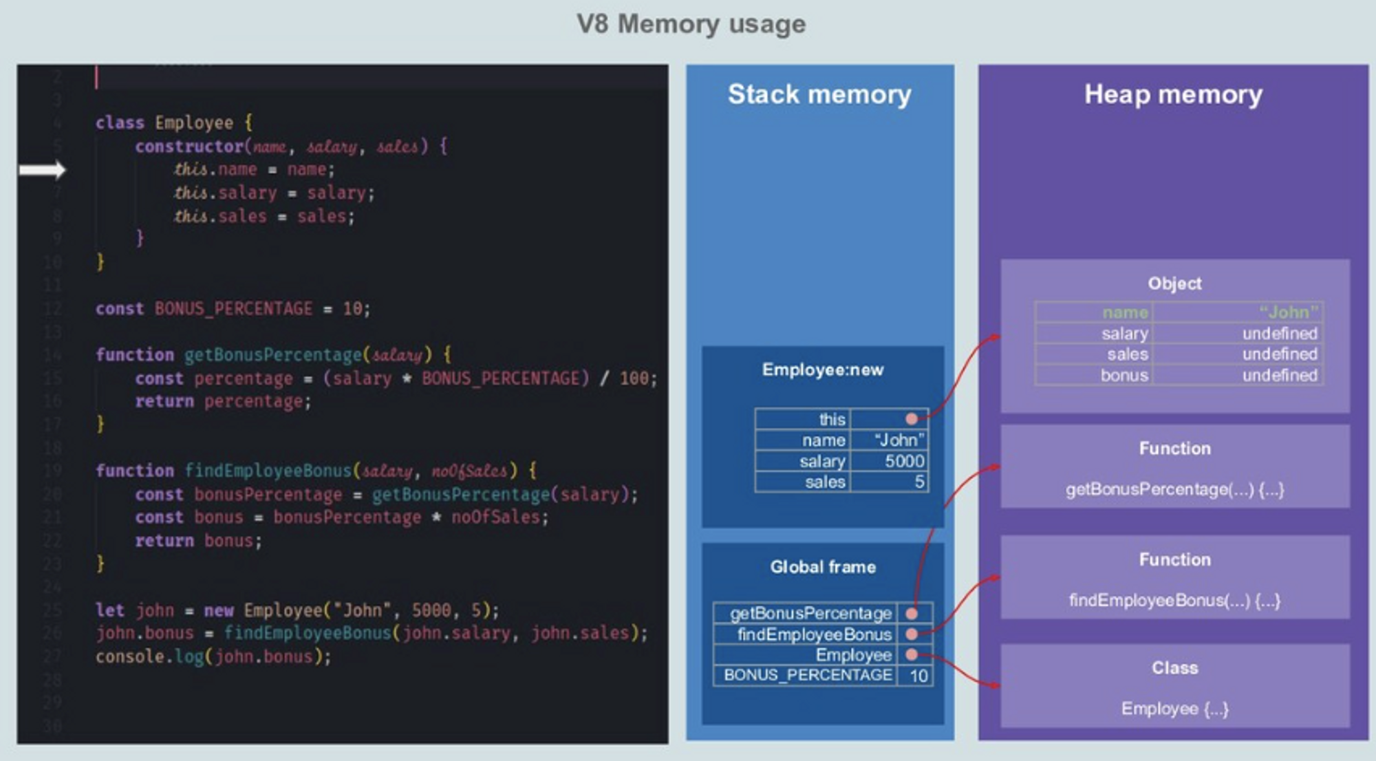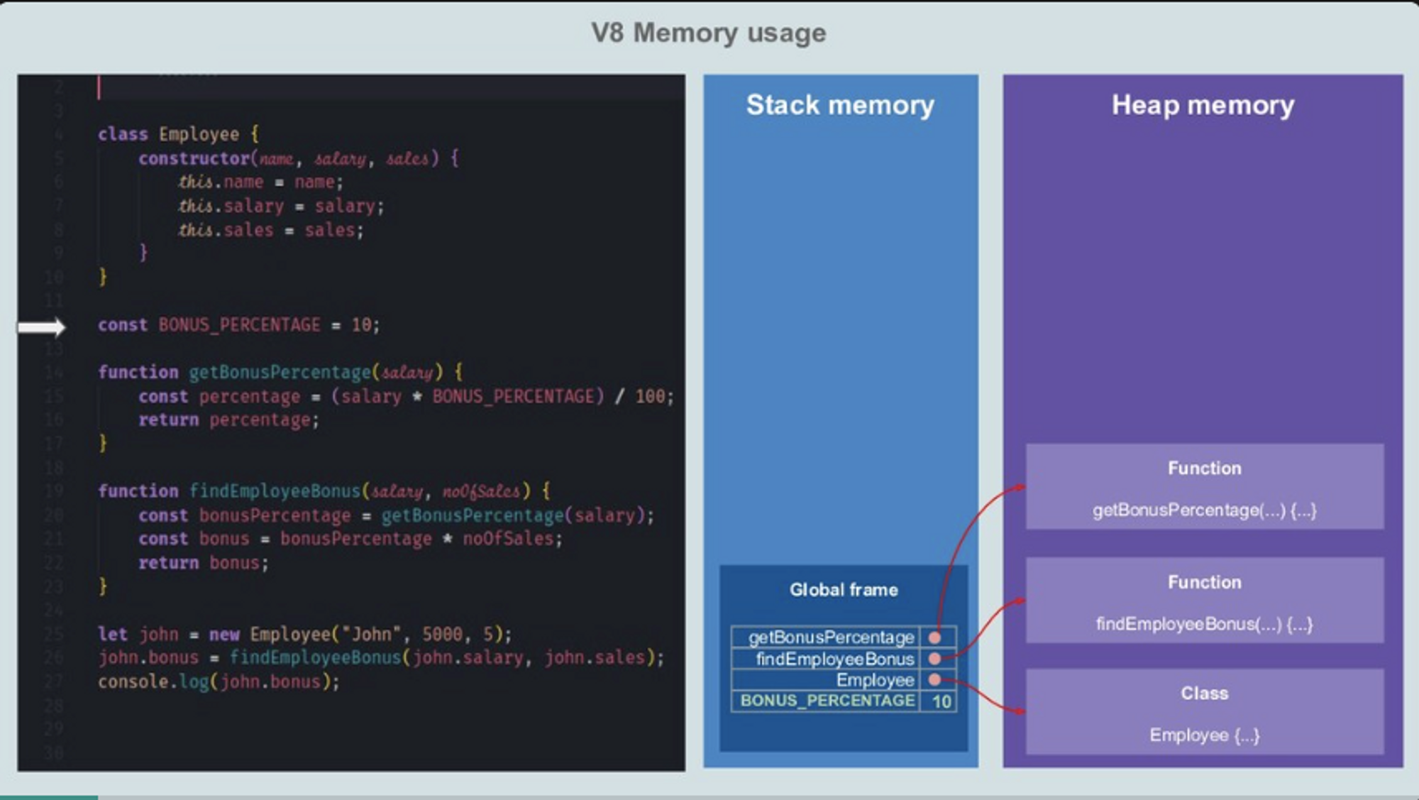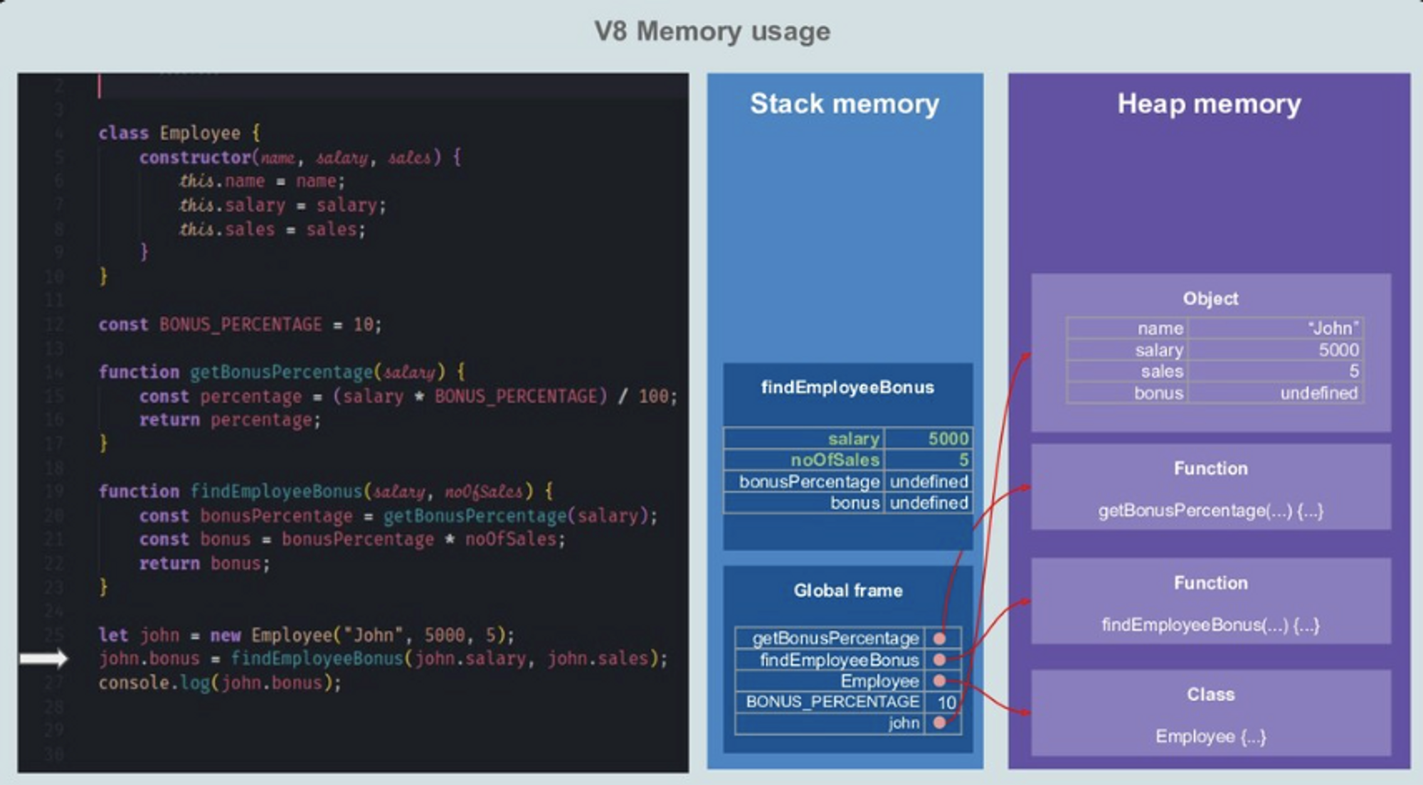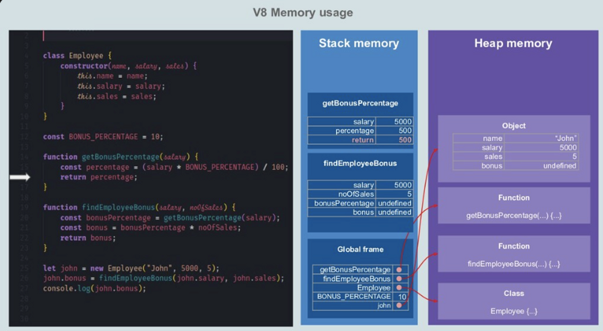class Employee { constructor(name, salary, sales) { this.name = name; this.salary = salary; this.sales = sales; } } const BONUS_PERCENTAGE = 10; function getBonusPercentage(salary) { const percentage = (salary * BONUS_PERCENTAGE) / 100; return percentage; } function findEmployeeBonus(salary, noOfSales) { const bonusPercentage = getBonusPercentage(salary); const bonus = bonusPercentage * noOfSales; return bonus; } let john = new Employee("John", 5000, 5); john.bonus = findEmployeeBonus(john.salary, john.sales); console.log(john.bonus);위 코드는 Stack과 Heap 메모리 사용 과정을 이해하기 위한 예시 코드이며 다음과 같은 동작을 수행한다.