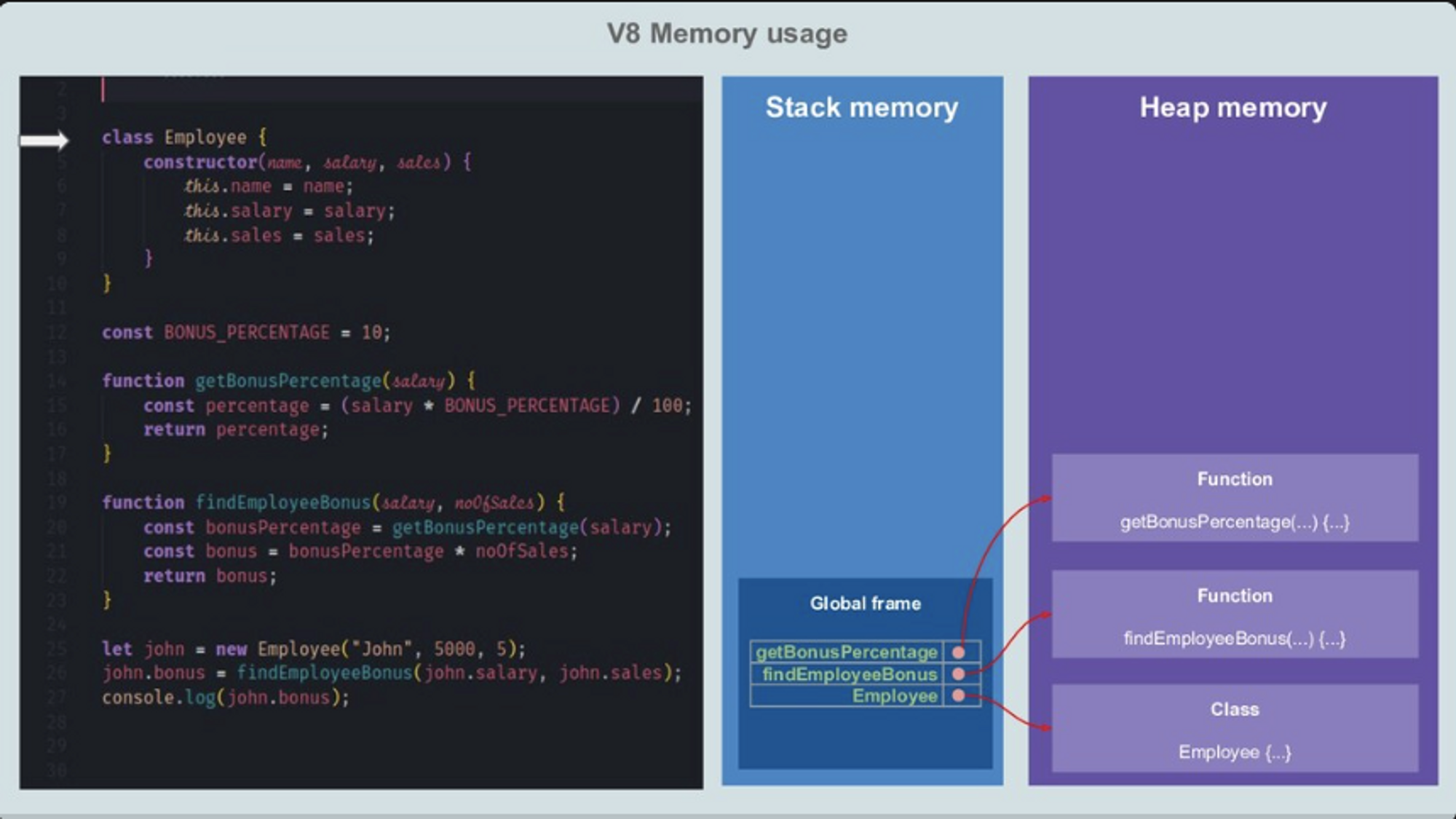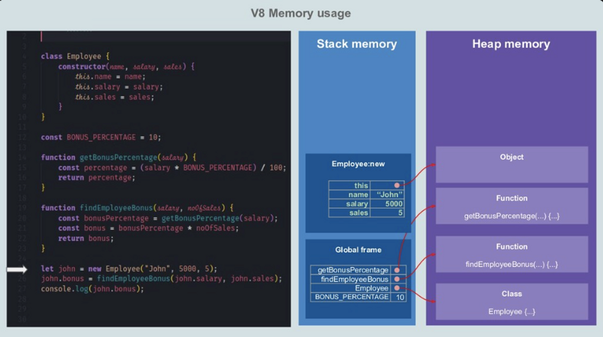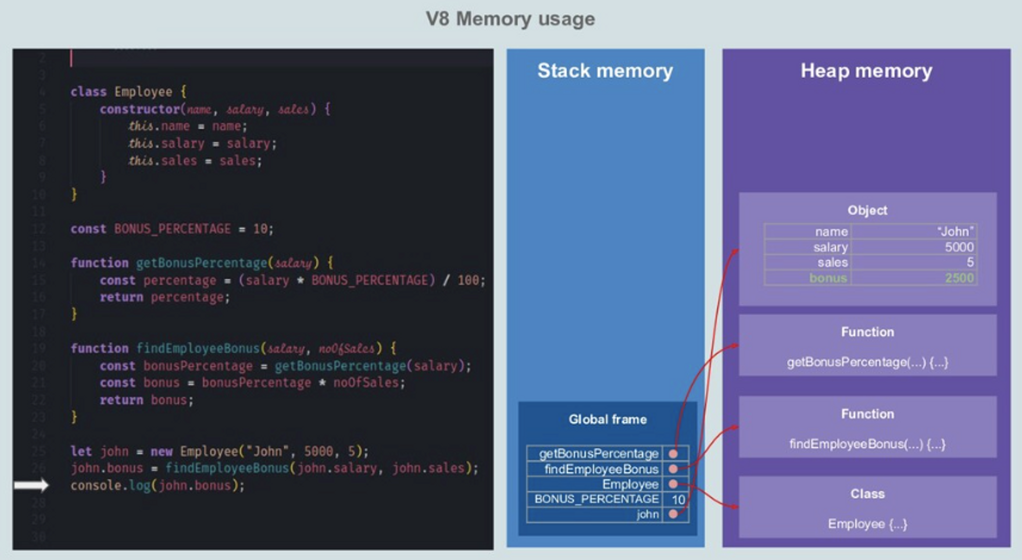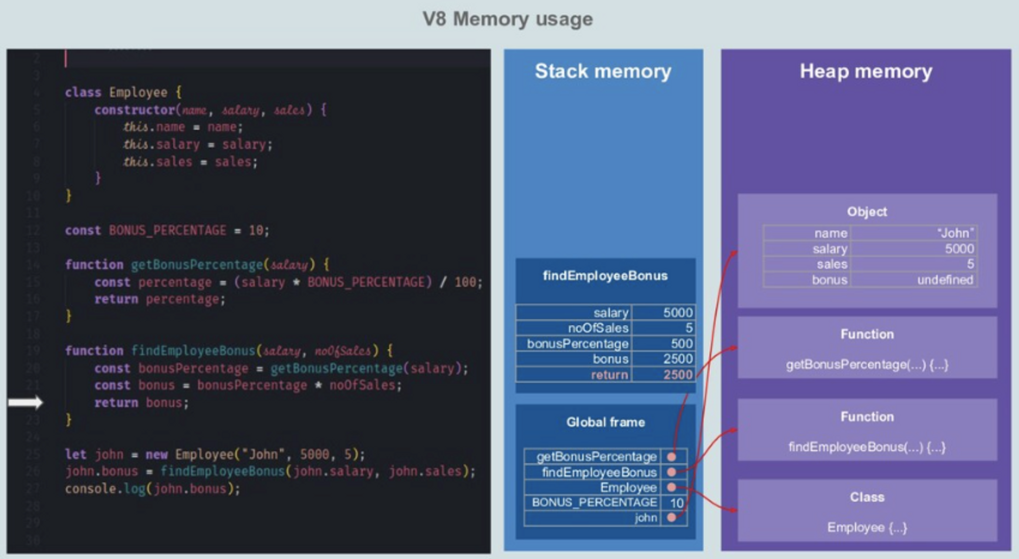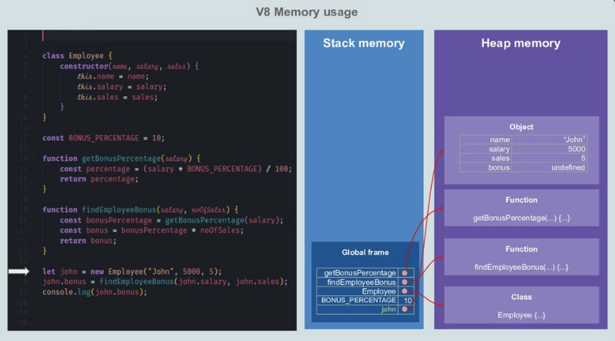 class Employee { constructor(name, salary, sales) { this.name = name; this.salary = salary; this.sales = sales; } } const BONUS_PERCENTAGE = 10; function getBonusPercentage(salary) { const percentage = (salary * BONUS_PERCENTAGE) / 100; return percentage; } function findEmployeeBonus(salary, noOfSales) { const bonusPercentage = getBonusPercentage(salary); const bonus = bonusPercentage * noOfSales; return bonus; } let john = new Employee("John", 5000, 5); john.bonus = findEmployeeBonus(john.salary, john.sales); console.log(john.bonus);위 코드는 Stack과 Heap 메모리 사용 과정을 이해하기 위한 예시 코드이며 다음과 같은 동작을 수행한다.