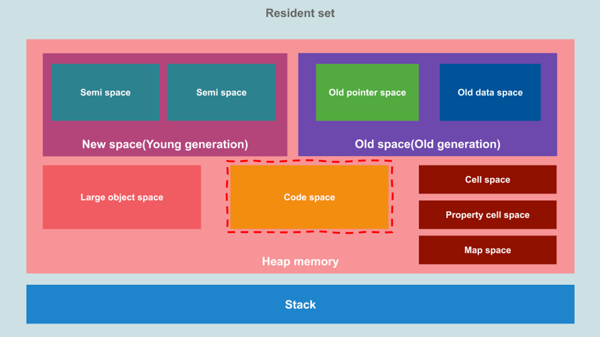 - 유일하게 실행 가능한 메모리가 있음(코드들은 "Large object space"에 할당될 수도 있고, 실행도 가능함)