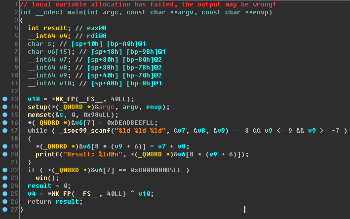 v6[8 * (v9 + 6)] = v7 + v8 에서 v9에 대한 입력 조건을 만족하면서 v6배열을 건드릴 수 있는 v9는 -6과 -5다.