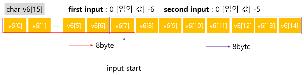 second input 그리고 -5를 입력했을 때 다음과 같이 v6[7 ~ 14] 공간에 접근 및 값을 쓸 수 있다.