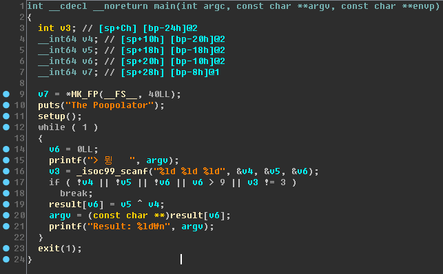 IDA-View main() main()함수에서 무한 루프를 돌며 v4, v5, v6에 %ld(long)으로 입력받는다.