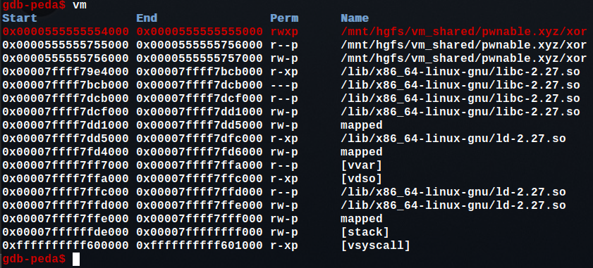 gdb-peda$ vm 하지만 위와 같이 코드 영역에 w(write)권한이 있기 때문에 result[v6] = v5 ^ v4을 통해 코드 패치가 가능하다.