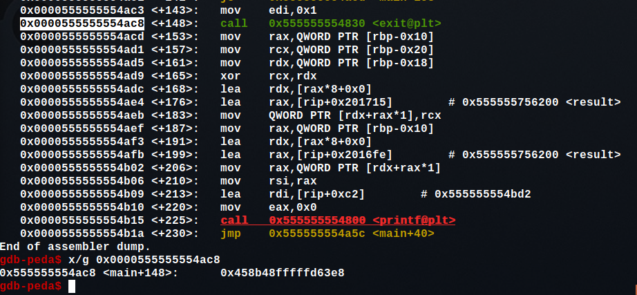 gdb-peda$ x/g <main+148> 현재 <main+148>에는 0x458b48fffffd63e8이 저장되어있다.