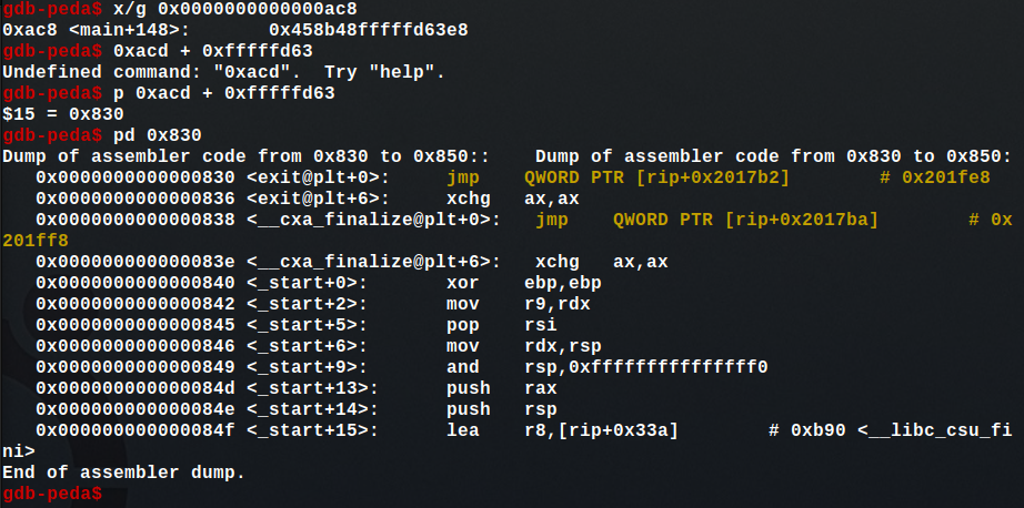 쉽게 이해하기 위해 <main+148>이 실행될 때의 rip인 0xacd에 0xfffffd63를 더해 보면 0x830, exit@plt가 나온다.