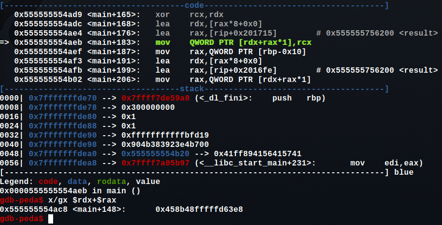 gdb-peda$ pd main xor결과가 rcx에 저장되고 <main+183>에서 mov QWORD PTR [rdx+rax*1], rcx로 result를 기준으로 특정 위치에 해당 값을 넣는다.